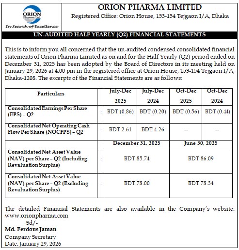 Un-audited Half Yearly Financial Statement of Orion Pharma Limited